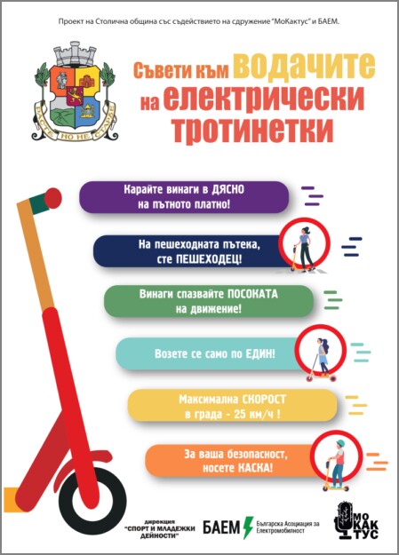 пълноцветен постер със съвети към водачите на ел. тротинетки, които ще се разпространяват в училищата, университетите и фирмите, продаващи тротинетки и аксесоари за тях